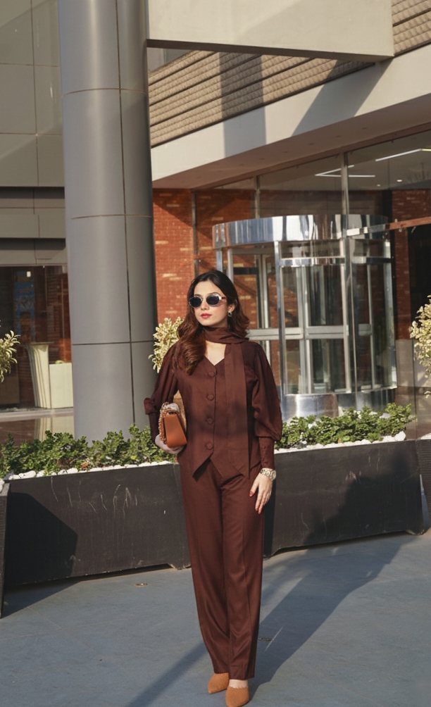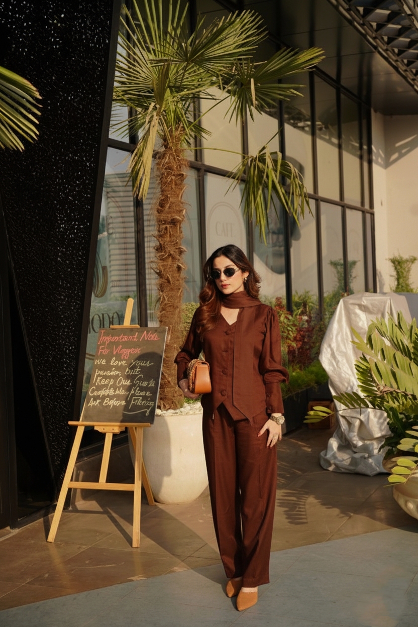 A rich chocolate-brown co-ord with pleated shoulders, fabric-covered buttons, and a signature neckline. Styled with a matching scarf, it pairs with straight-fit trousers for a sleek, polished look perfect for elevated everyday wear.